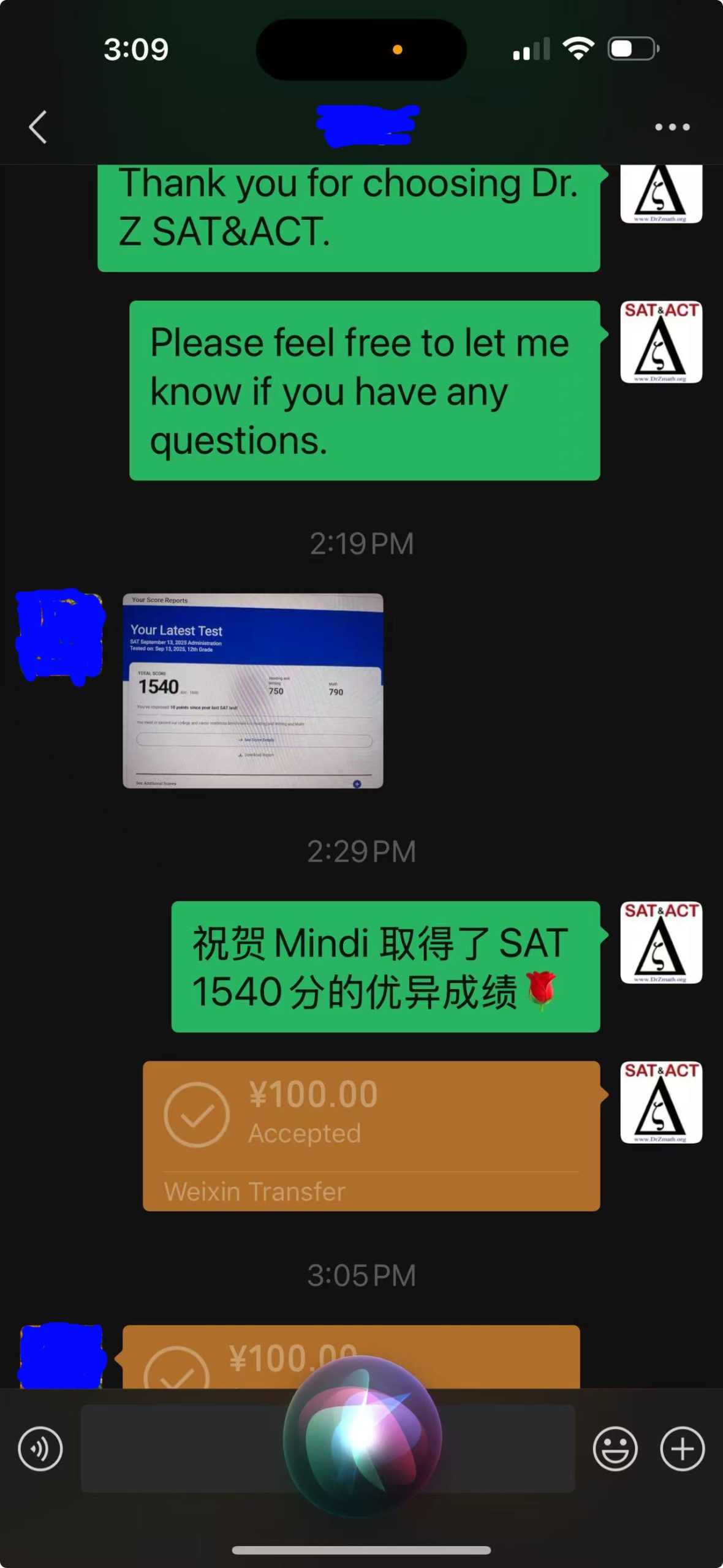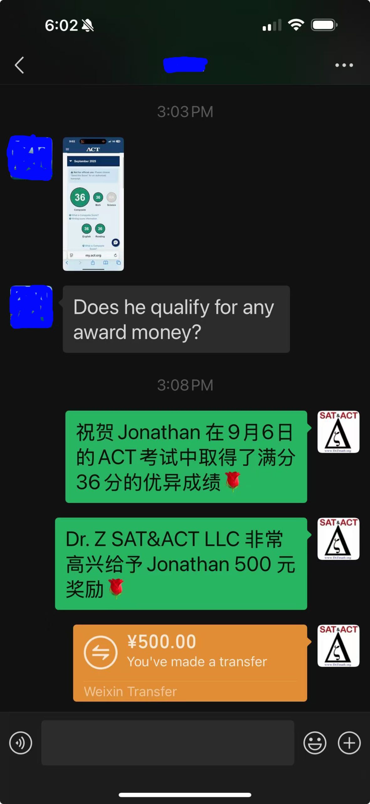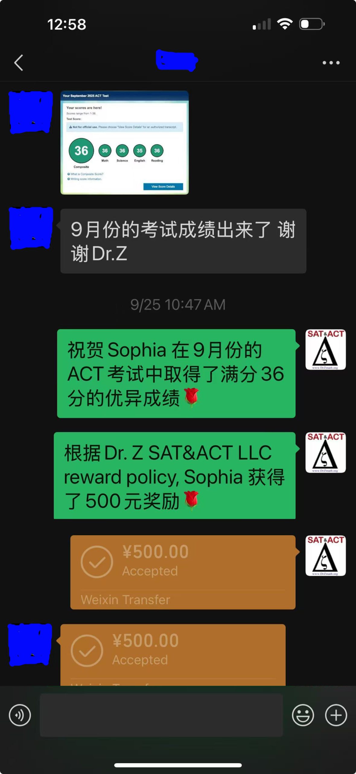 祝贺Alina Z. 同学在 2023 99 日的 ACT 考试中获得了满分 36 分的优异成绩。第三张手机截图是 2023811 日我们在家长群里预测学员们在 826 日的 SAT 以及 99 日的 ACT 考试成绩。结果完全证实了我们的预测,说明 Dr. Z 在线考试平台练习结果与真实考试结果的高度相关性、可预测性。
