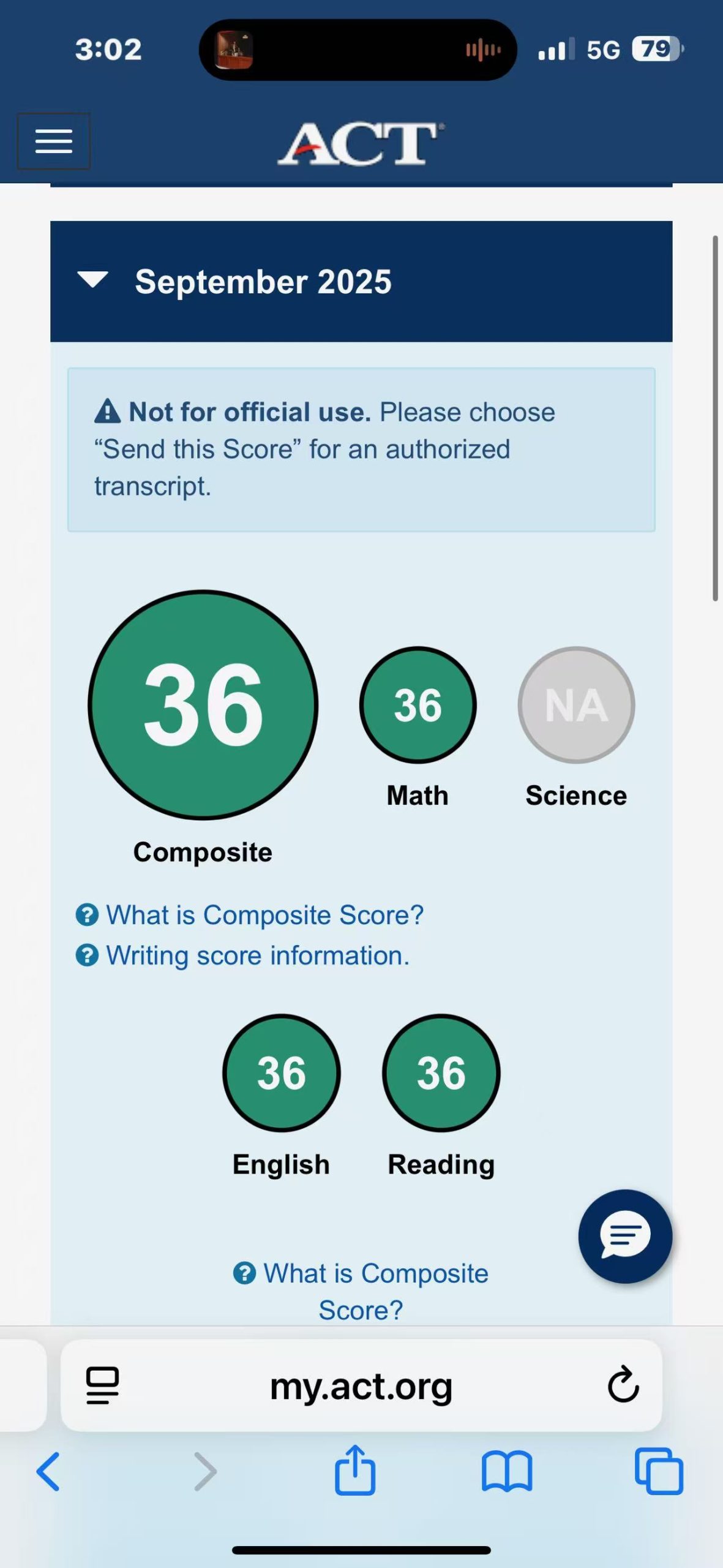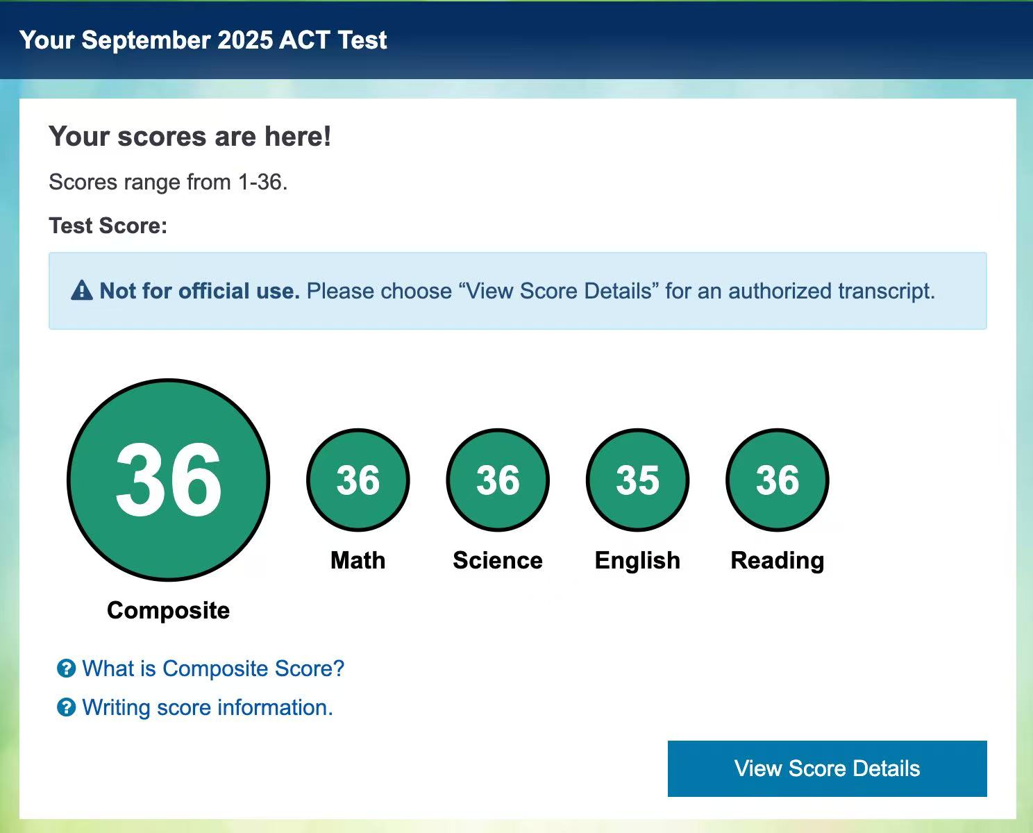 祝贺 Sophia W. 同学在 202596 号的 ACT 考试中取得了满分 36 分的优异成绩。