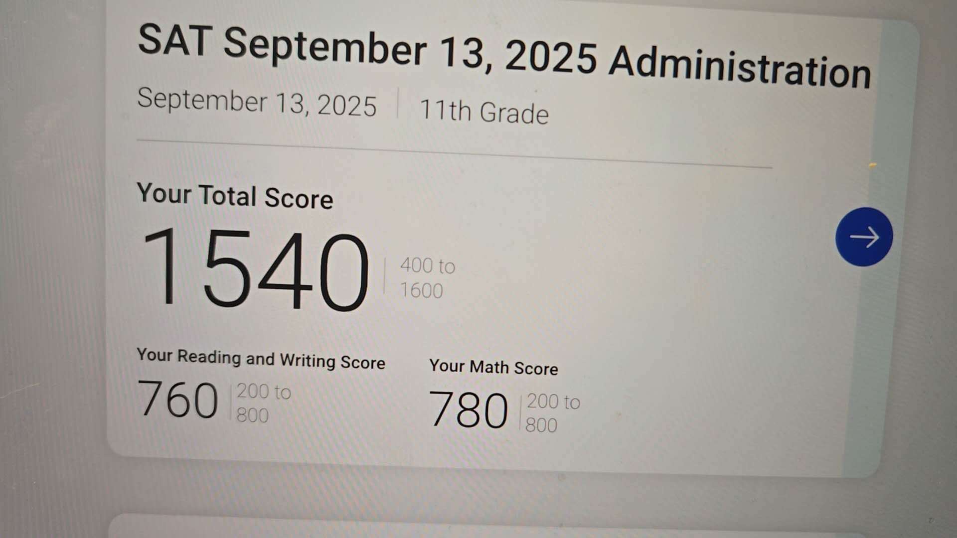 祝贺 Mindi C. 同学在 2025913 号的 SAT 考试中取得了 1540 分的优异成绩。