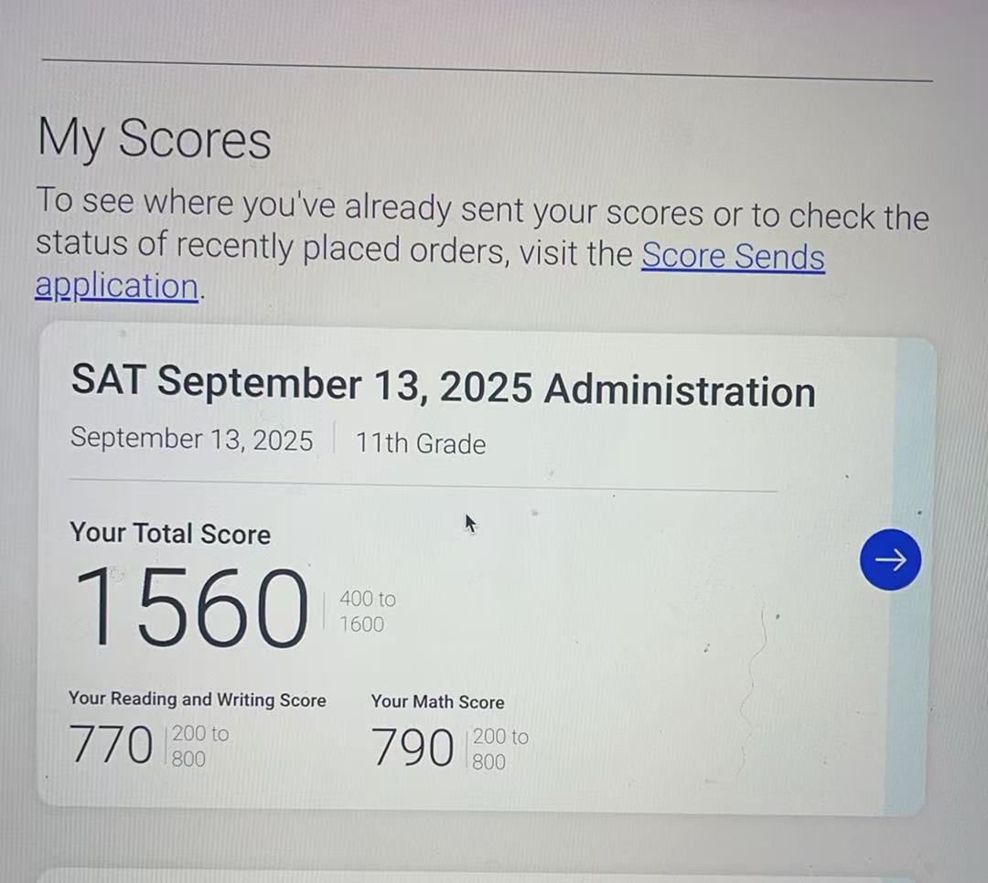 祝贺 Elizabeth L. 同学在 2025104 号的 SAT 考试中取得了 1560 分的优异成绩。