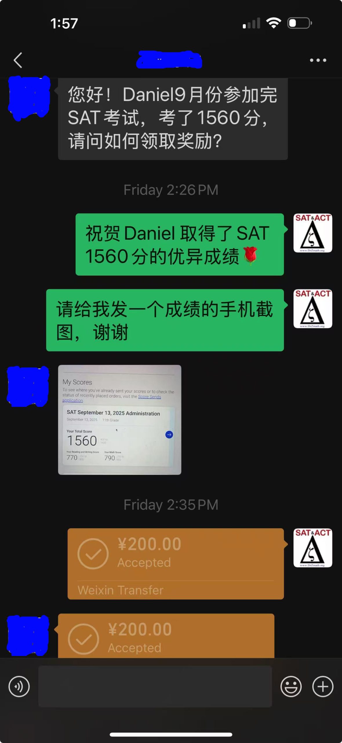 祝贺 Brian L. 同学在 20254 月 2 号的 SAT school day 考试中取得了 1550 分的优异成绩。