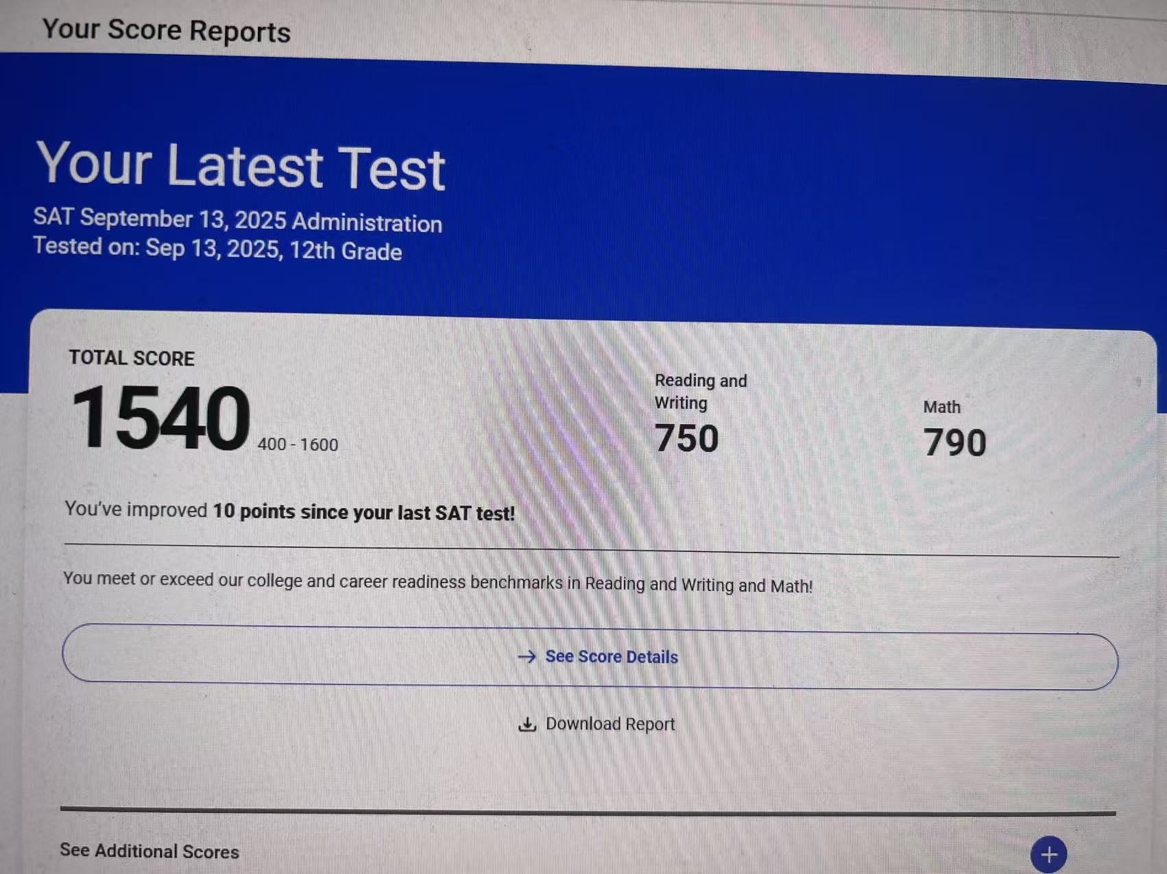 祝贺 Brandon G. 同学在 2025913 号的 SAT 考试中取得了 1540 分的优异成绩。