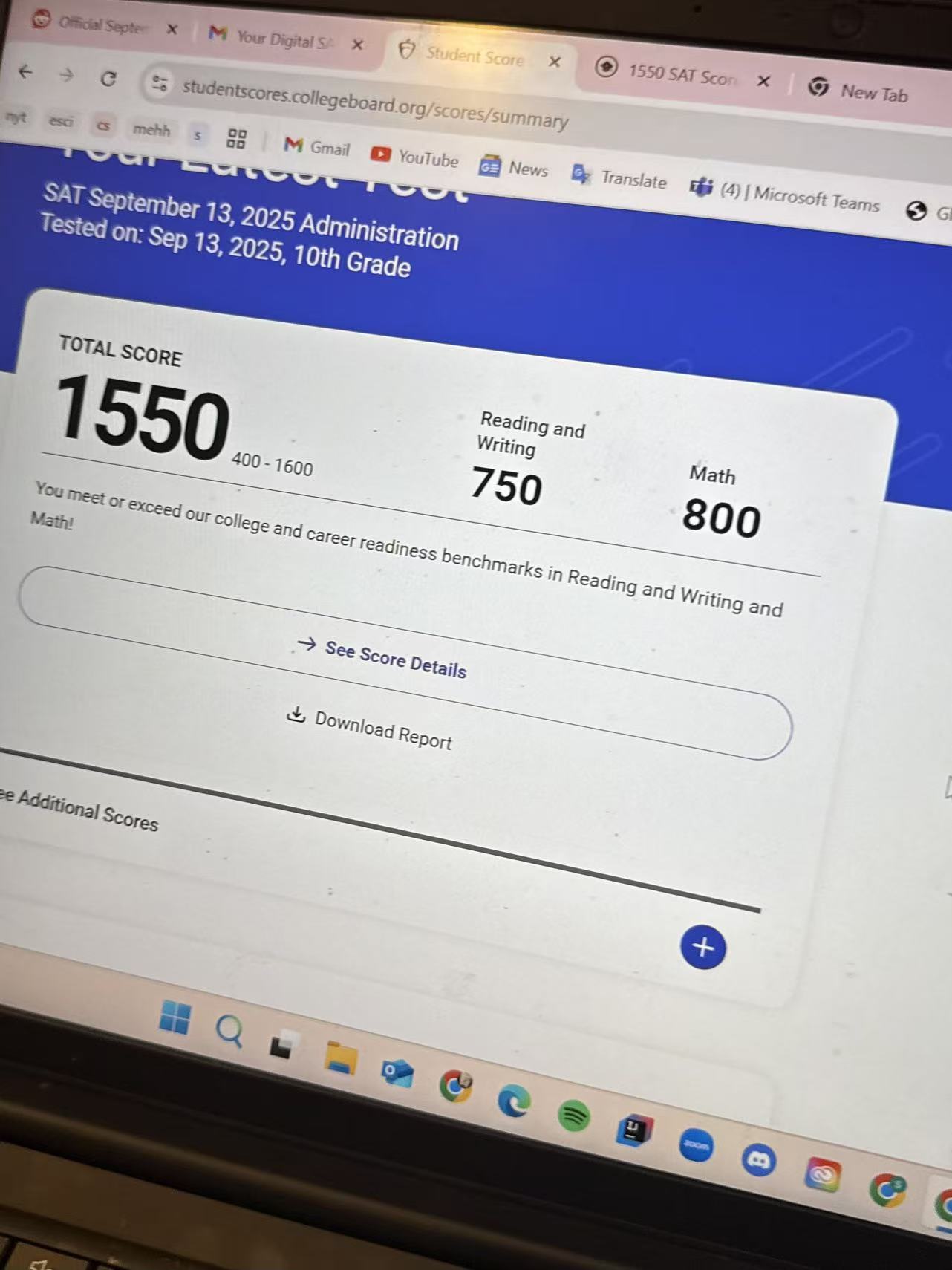 祝贺 Y. Deng 同学在 2025913 号的 SAT 考试中取得了 1550 分的优异成绩。