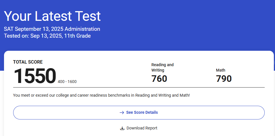 祝贺 Sophia W. 同学在 2025913 号的 SAT 考试中取得了 1550 分的优异成绩。