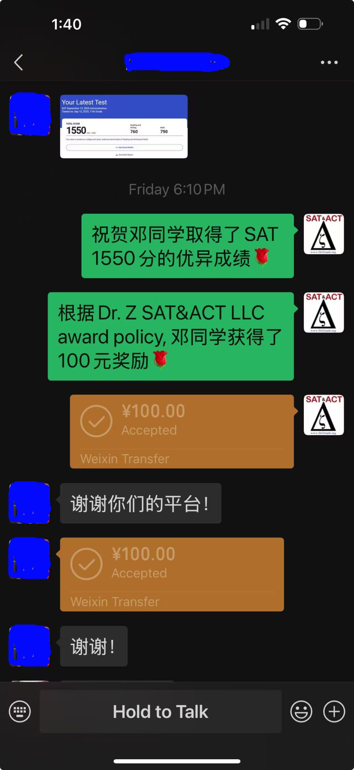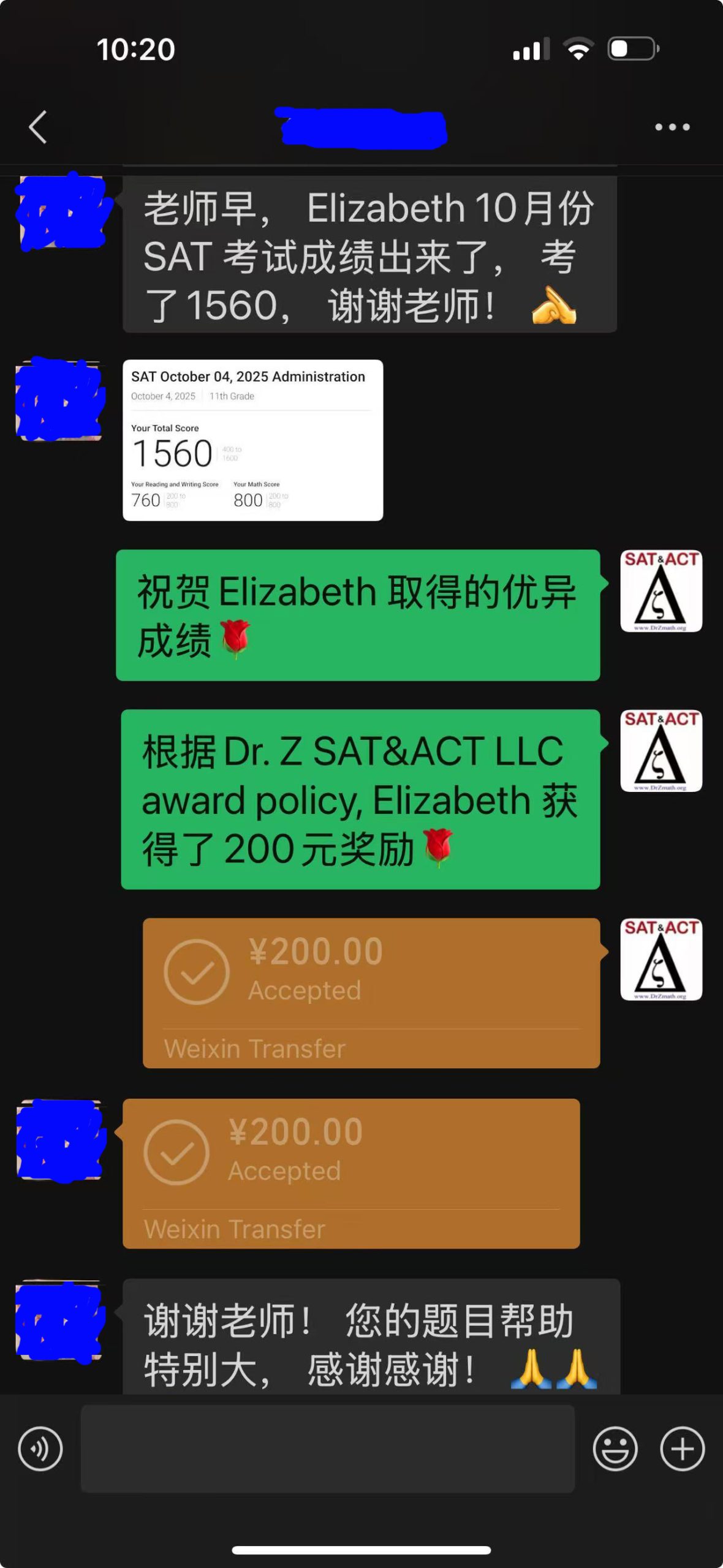 祝贺 William 同学在 2023 10 月份 的 PSAT 考试中获得了 1500 分 ( 满分 1520 ) 的优异成绩。下面的微信截图是 William 同学的妈妈 Sunny 发在微信小群里的。群里的泓姐起初为她女儿注册了 Dr. Z 在线考试平台,她的女儿获得了 ACT 满分。之后泓姐把 Dr. Z 在线考试平台推荐给了 SunnySunny 给孩子注册了 SAT。三个月后 William 2023 107 日的 SAT 考试中获得了 1550 分的优异成绩,并在 10 月份的 PSAT 考试中取得了 1500 分的优异成绩。