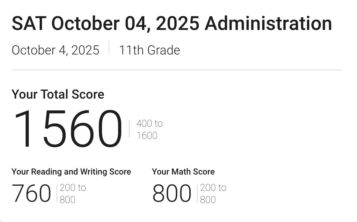 祝贺 Abby 同学在 2025823 号的 SAT 考试中取得了 1560 分的优异成绩。