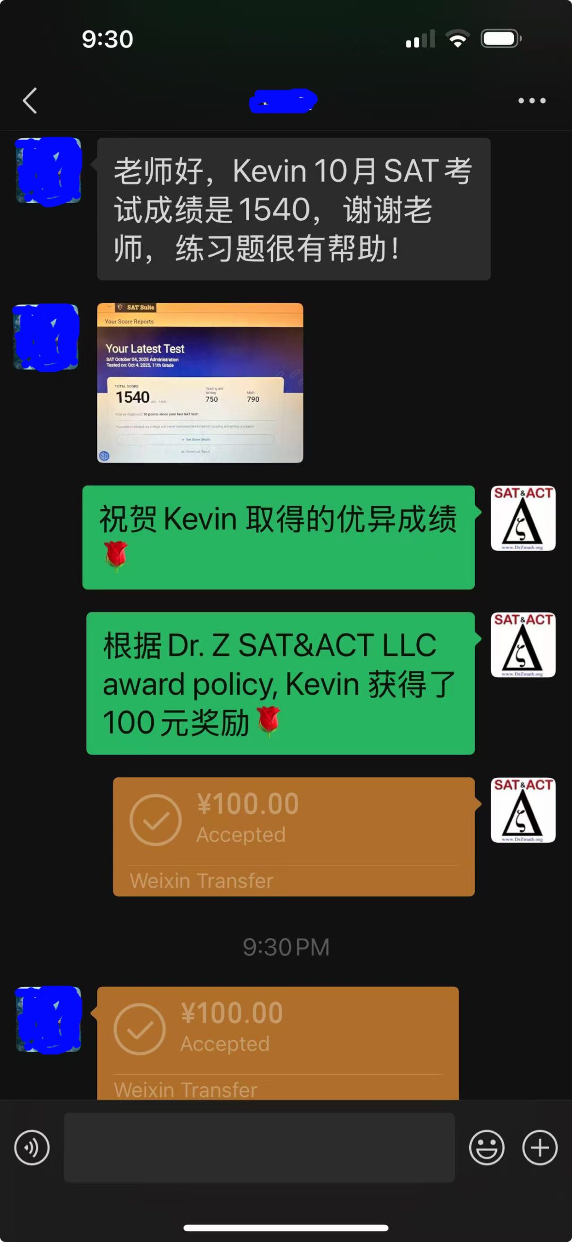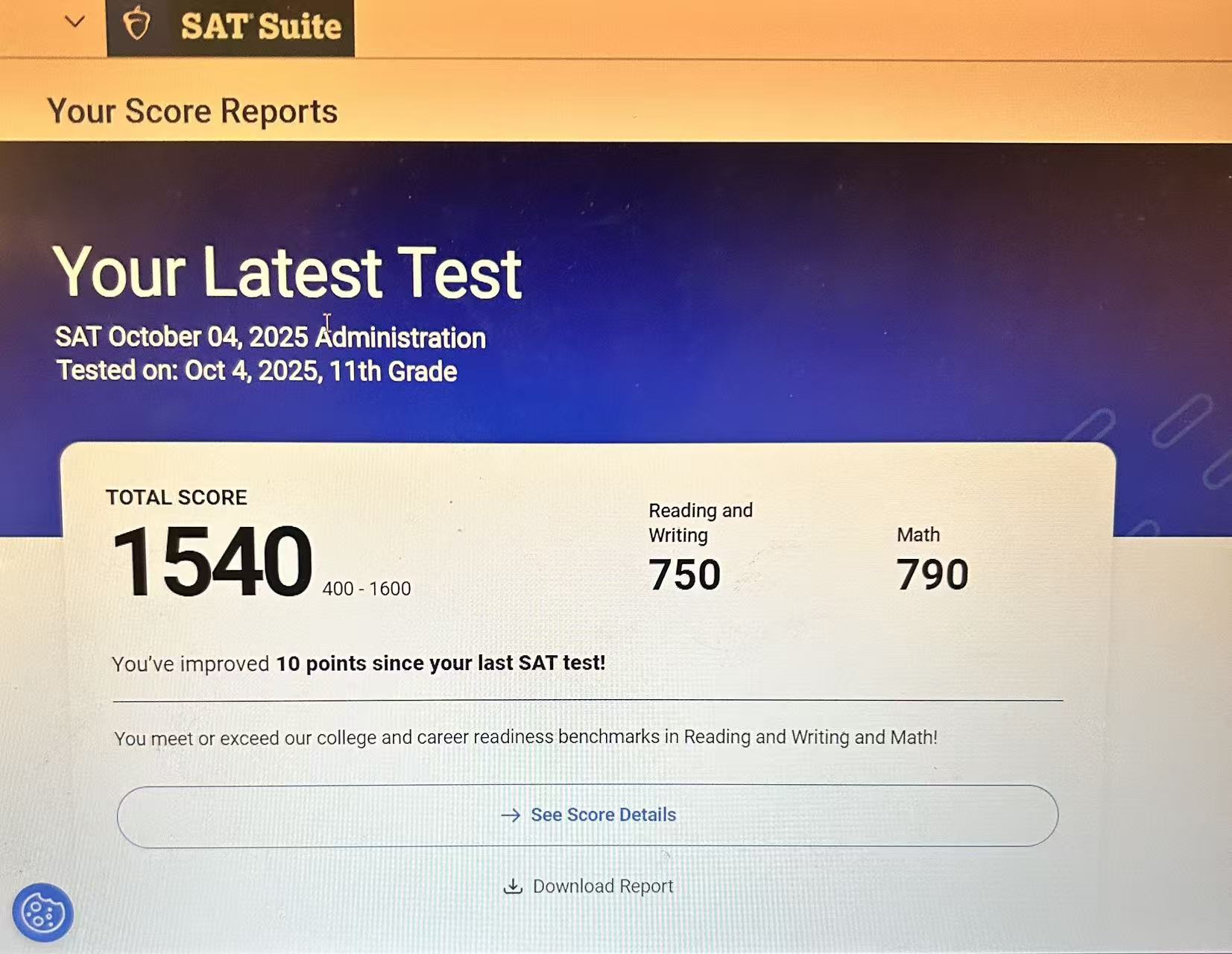 祝贺 Kevin H. 同学在 2025104 号的 SAT 考试中取得了 1540 分的优异成绩。