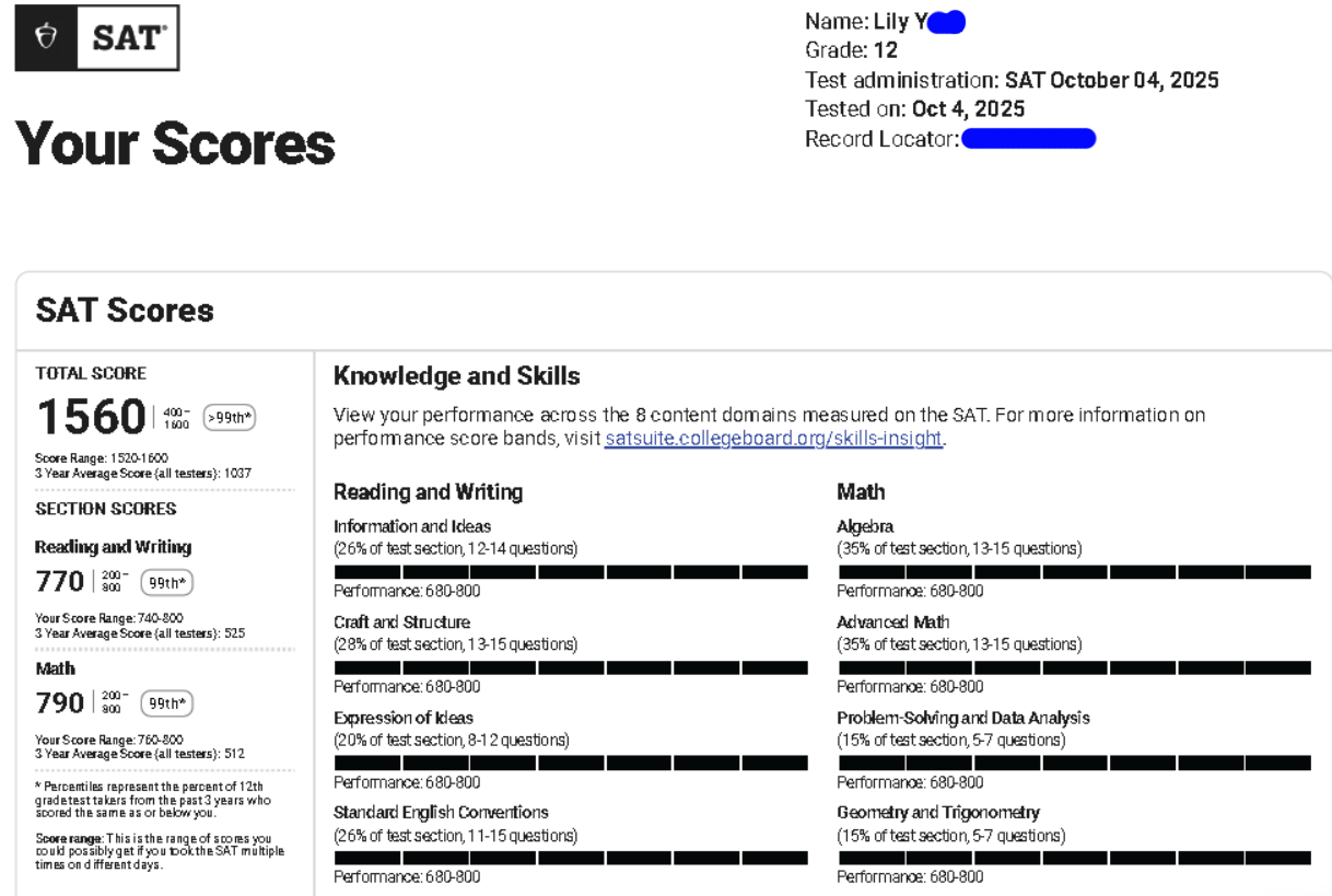祝贺 Lily Y. 同学在 2025104 号的 SAT 考试中取得了 1560 分的优异成绩。